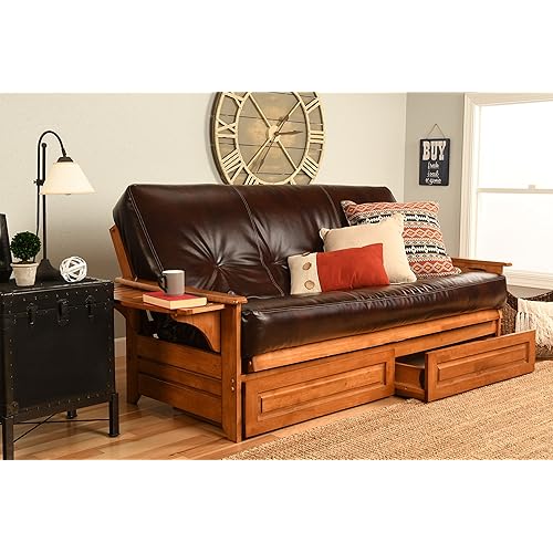 We did choose the drawers option, which i think makes it look more like a futon/bed than it futon/couch. The drawers below will be convenient storage for guests. We carry storage drawers for beds in all major sizes including full size bed storage drawers, queen size, twin and more! Sliding out the mattress is easy and smooth. This lovely futon frame will give your spare bedroom or den a stylish look, in a warm weathered oak finish.
